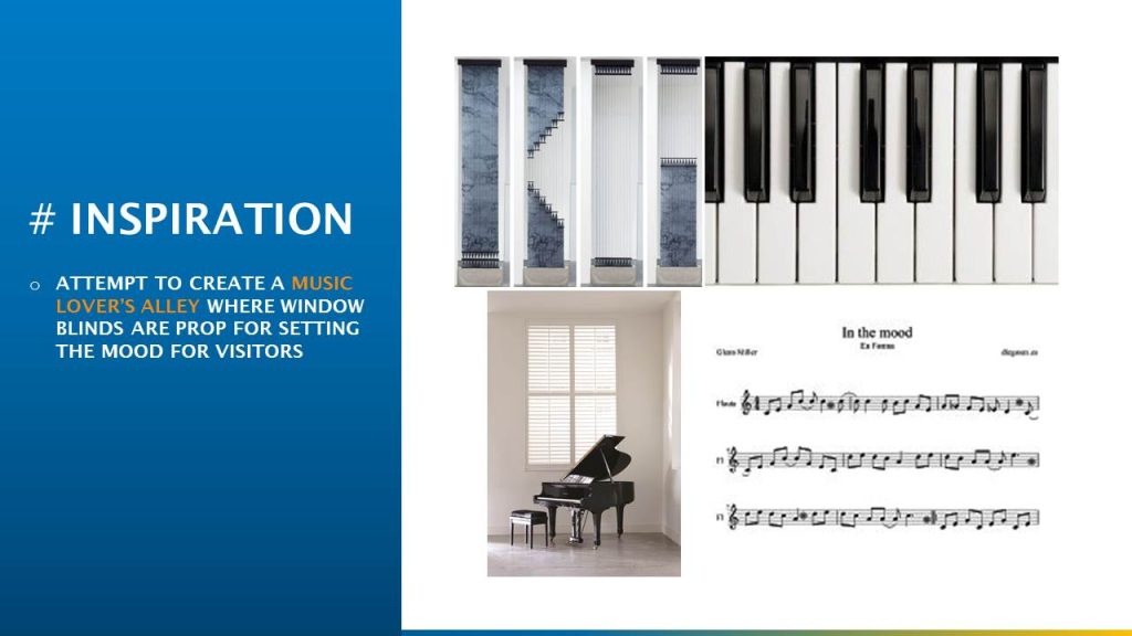One long wall was ideated as a giant piano wall with white hued blinds servings as white keys with extruded black keys. A guitar, wooden bar stool and notes stand served as props in the musical ambience.